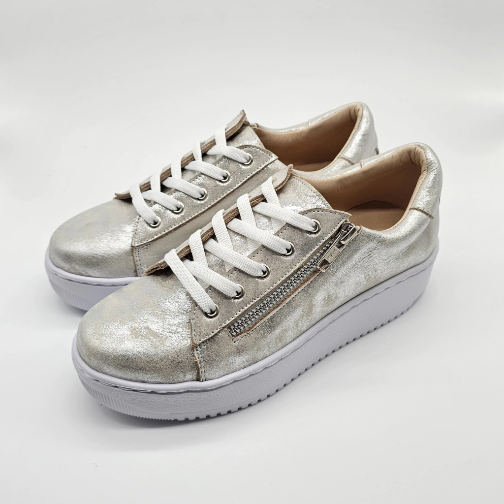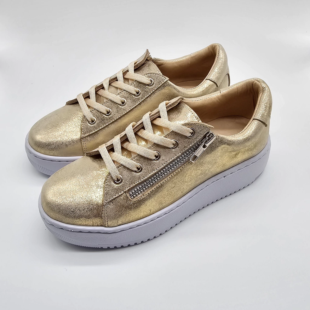Zapatilla confeccionada en cuero vacuno seleccionado en exterior e interior, con detalle de cierre lateral para facilitar el calce, plantilla y lengüeta acolchadas. Base de goma antideslizante y liviana de 4cm.