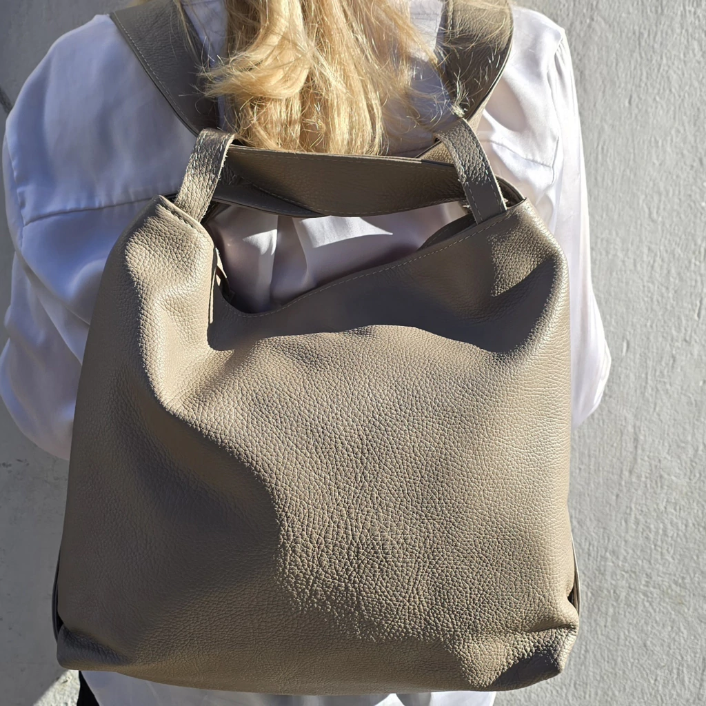 Su diseño innovador permite transformarla en mochila con un simple movimiento de sus correas dobles de cuero.