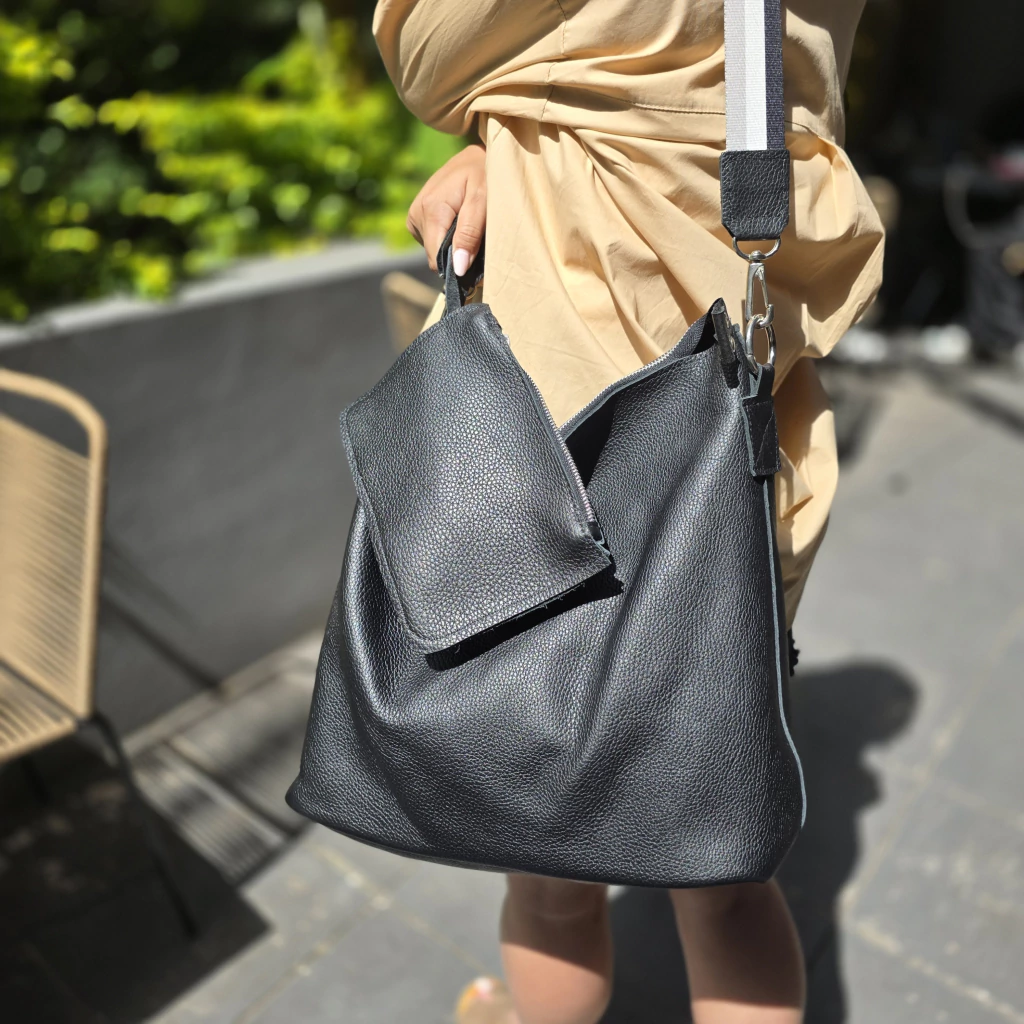 Shopping bag con cierre, confeccionada artesanalmente en cuero floater seleccionado.