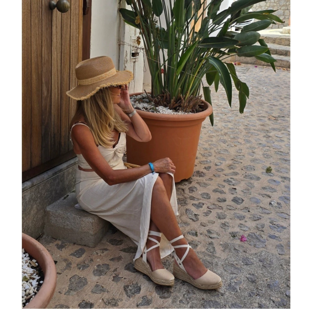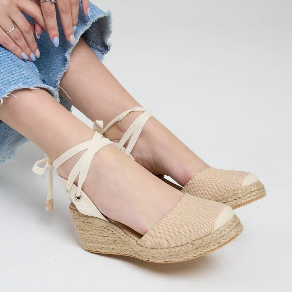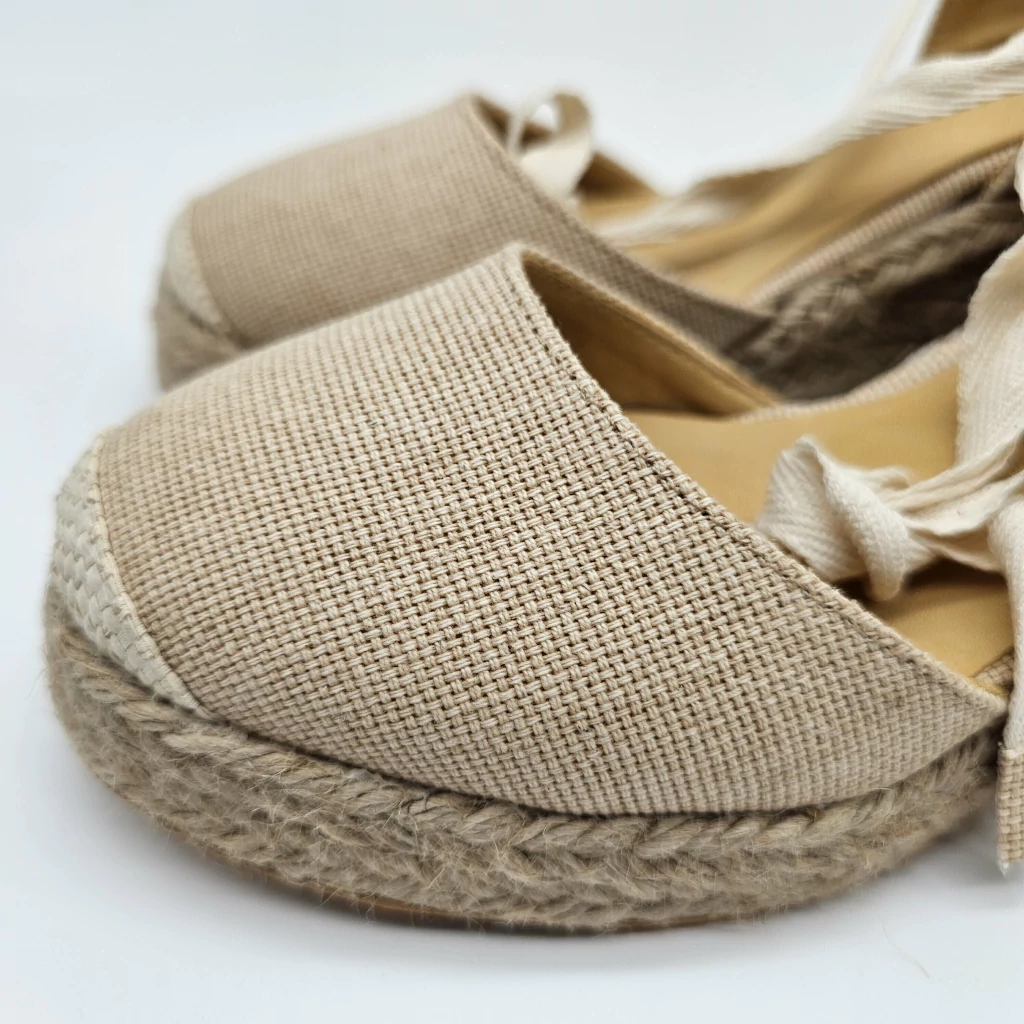 Sandalia totalmente artesanal con capellada de tela y talonera de rafia de algodón.