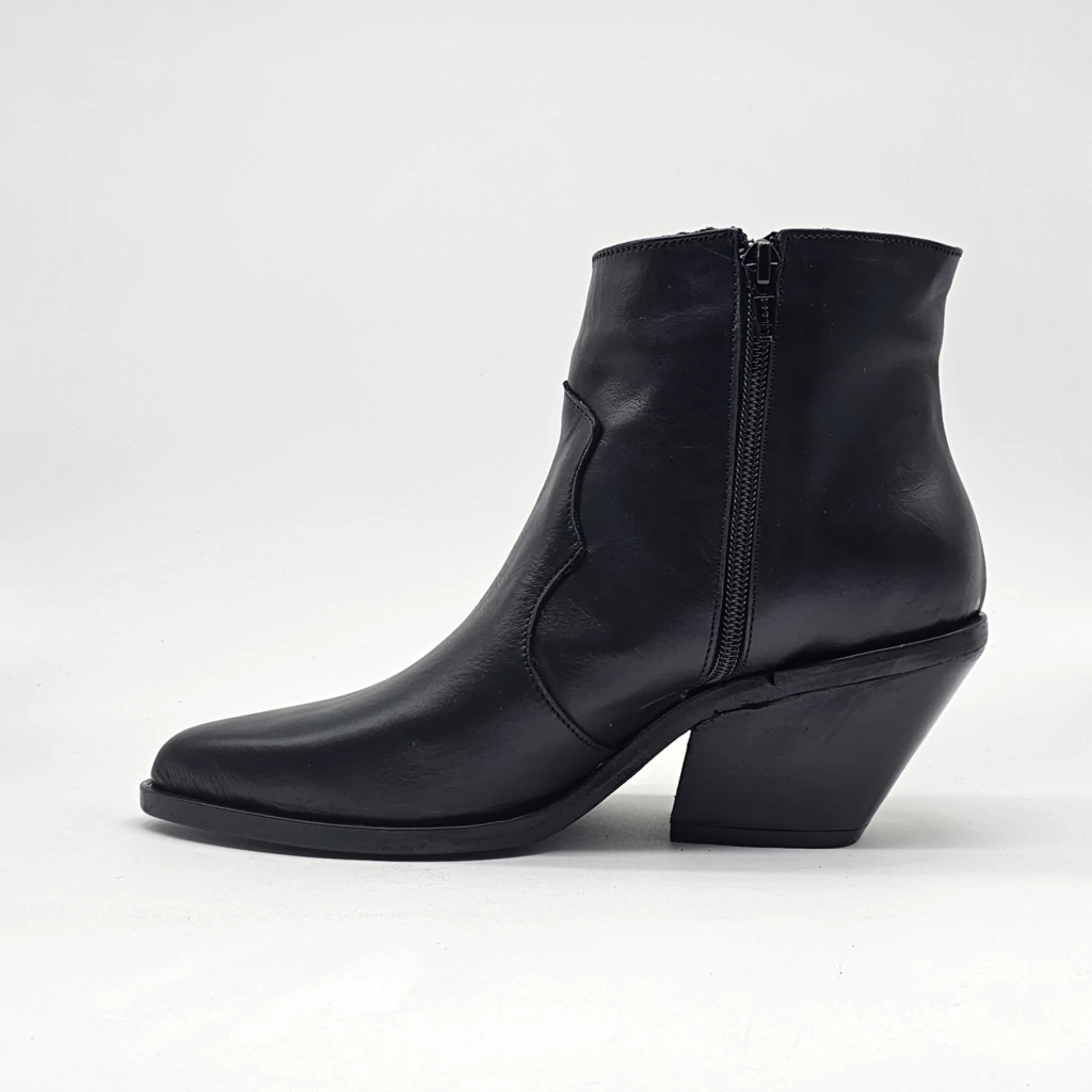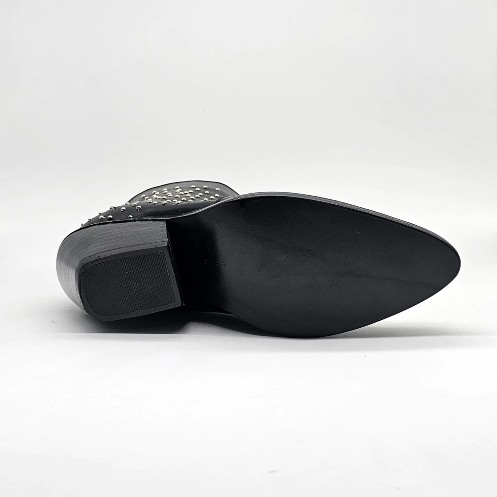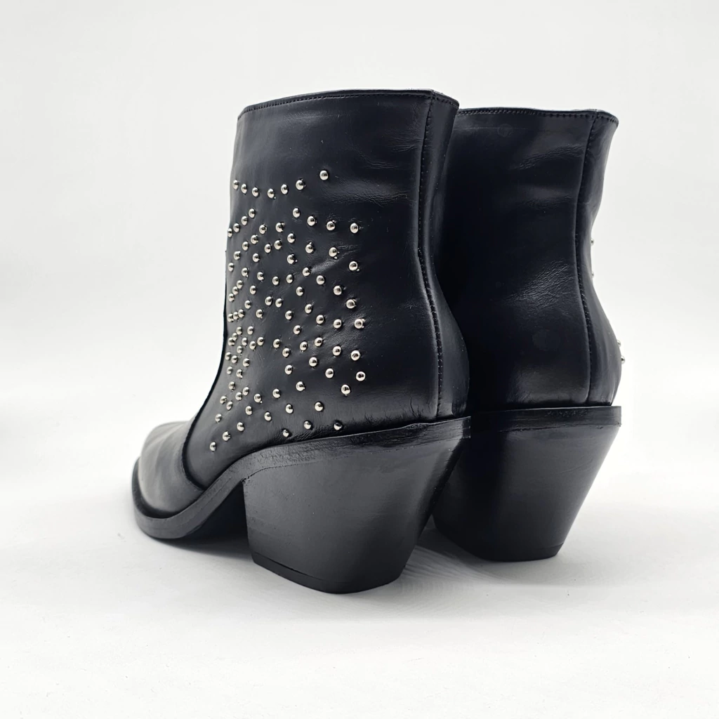 Bota confeccionada artesanalmente en cuero vacuno seleccionado en exterior e interior, con detalle de tachas en laterales y cierre interno. Sobre base de suela y taco foliado.