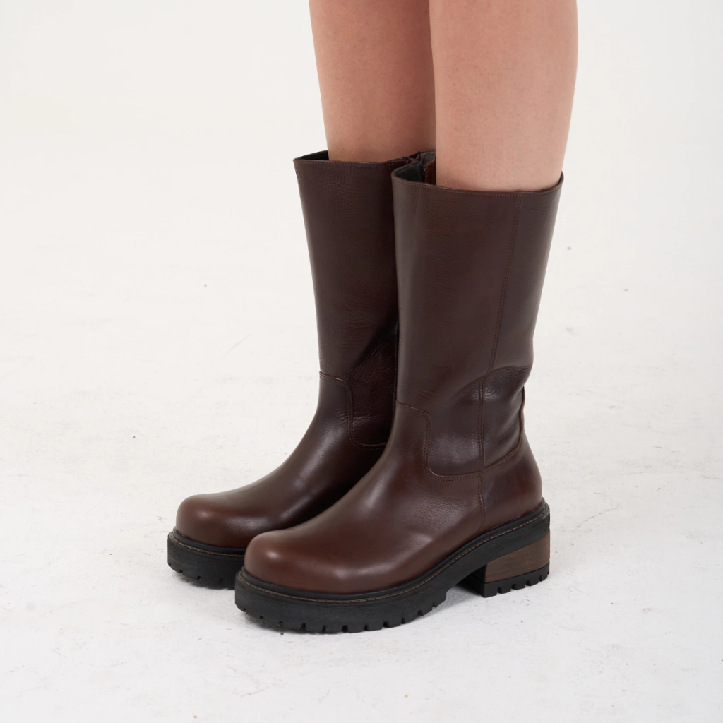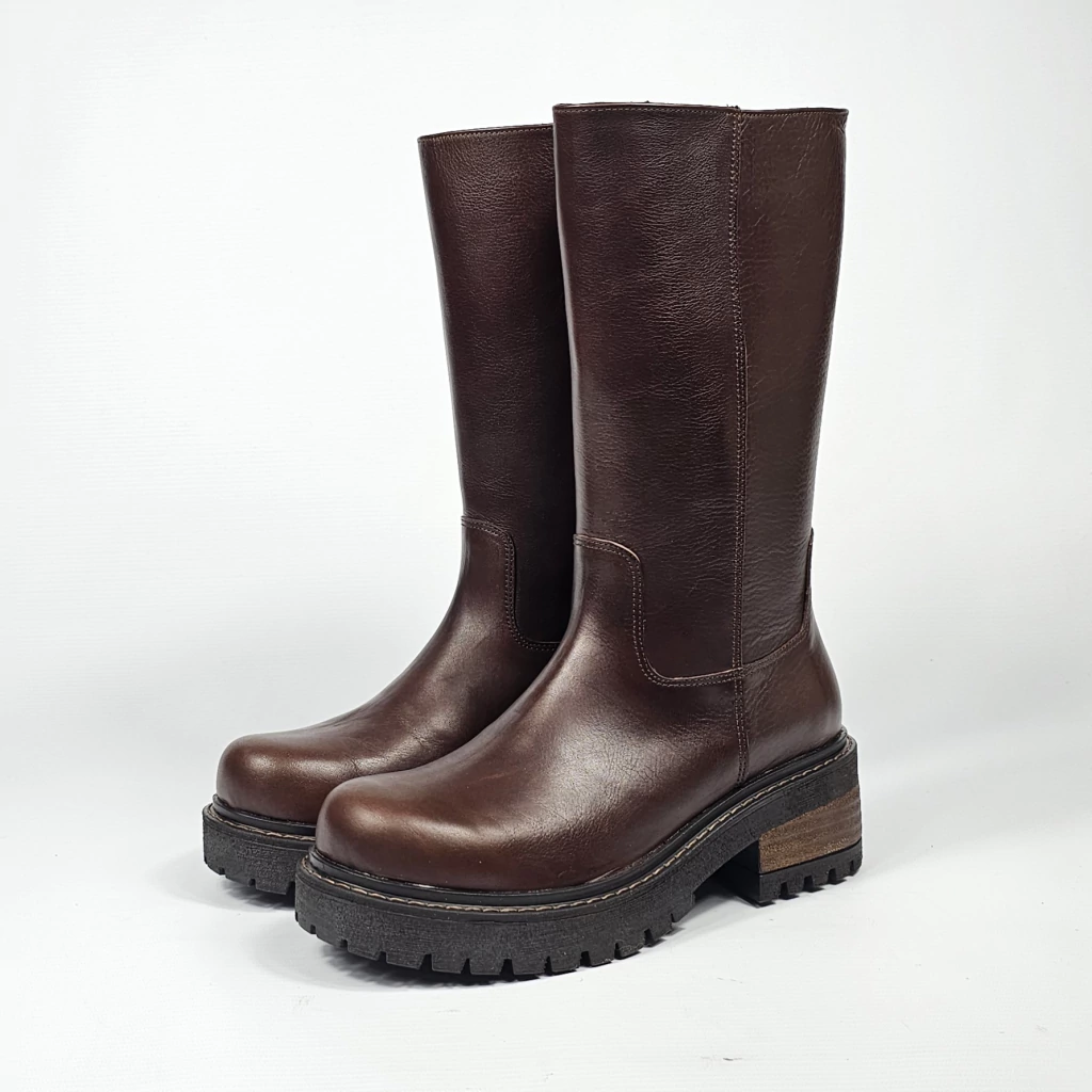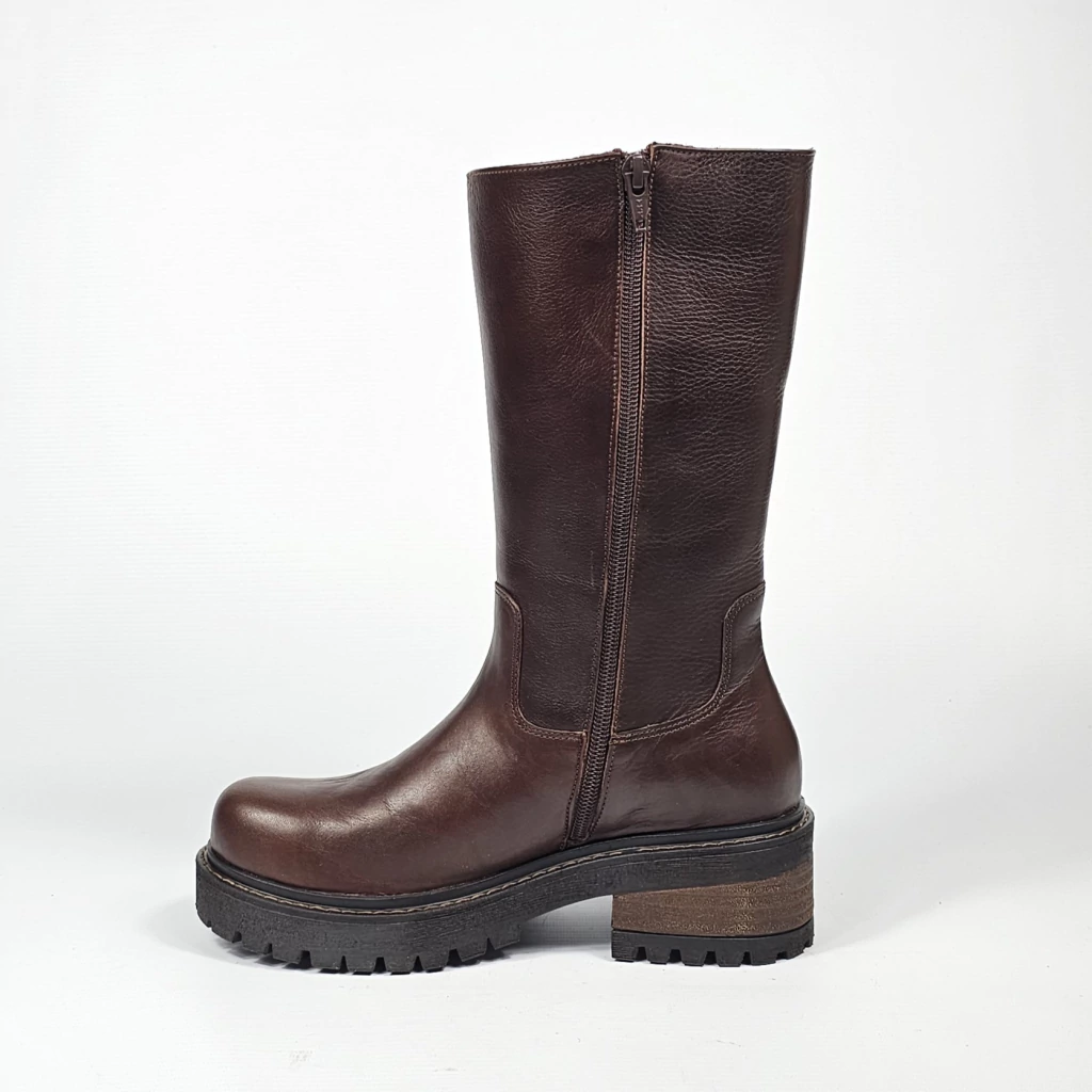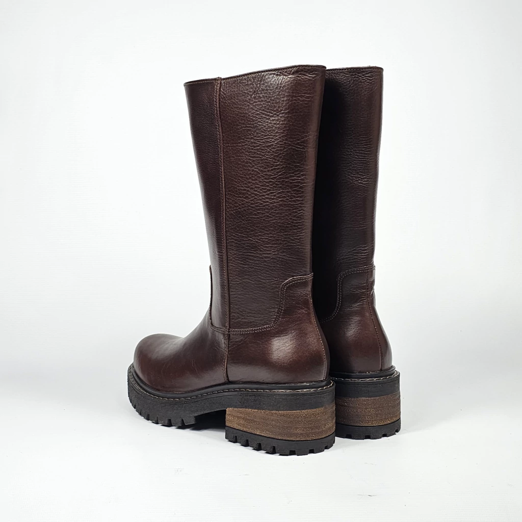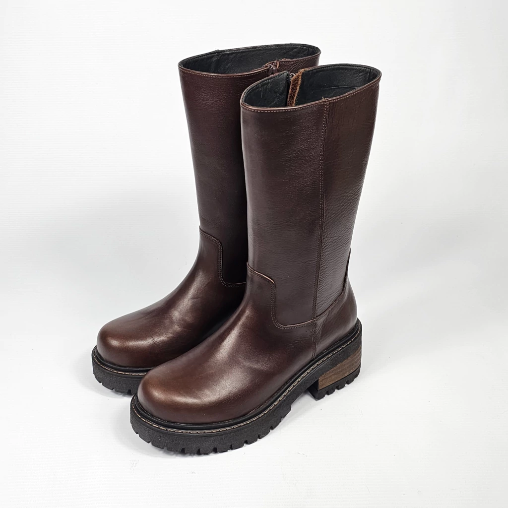 Bota confeccionada artesanalmente en cuero vacuno seleccionado en exterior e interior, con detalle de cierre interno. Sobre base de goma tipo ruta y taco foliado.