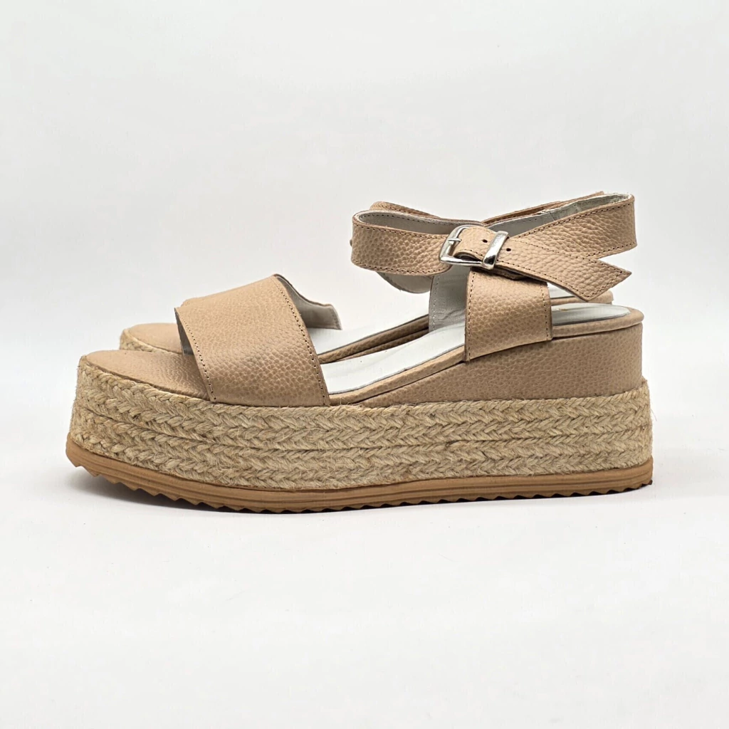 Sandalia confeccionada en cuero sobre base de goma eva ultraliviana forrada en yute de altura de 4.5 cm en plataforma y 7 cm de altura en talón.