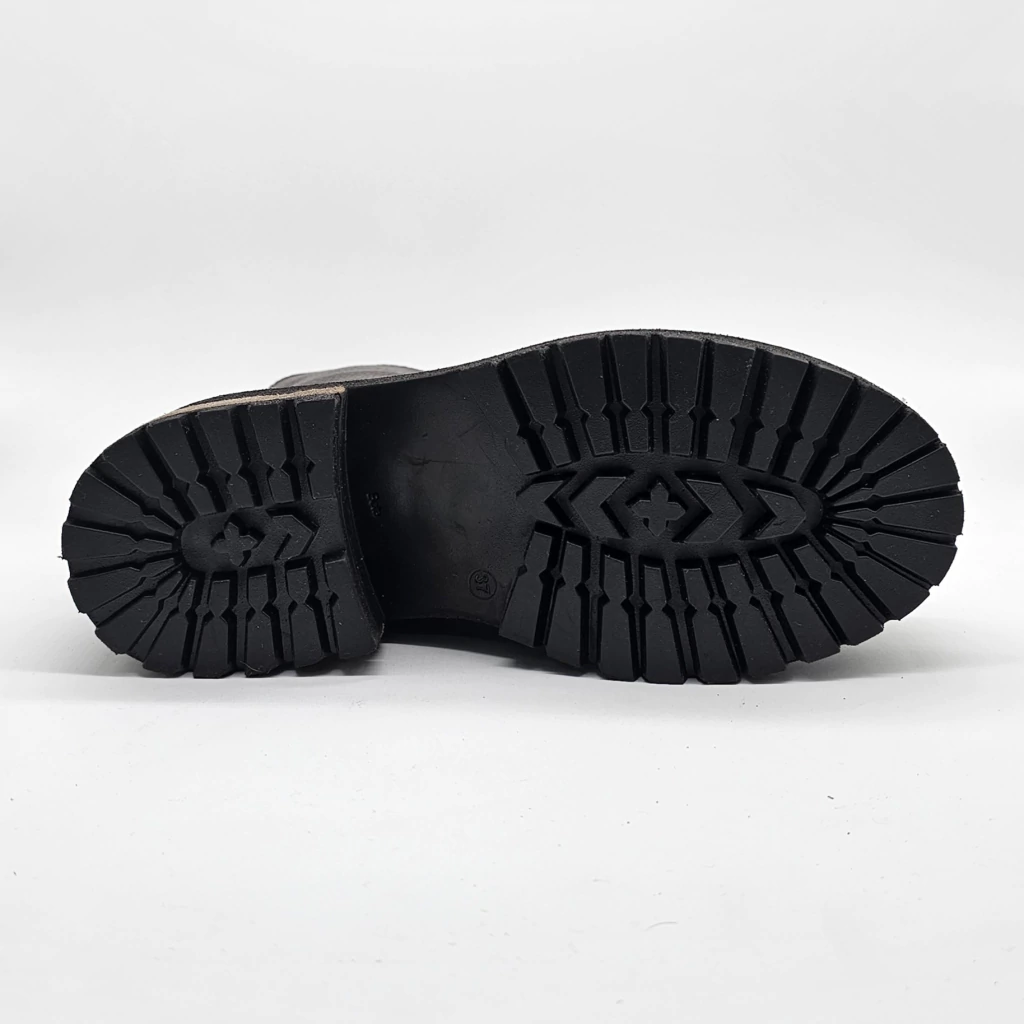 Borcego confeccionado artesanalmente integramente en cuero vacuno seleccionado en exterior e interior, acordonado y con cierre de costado .