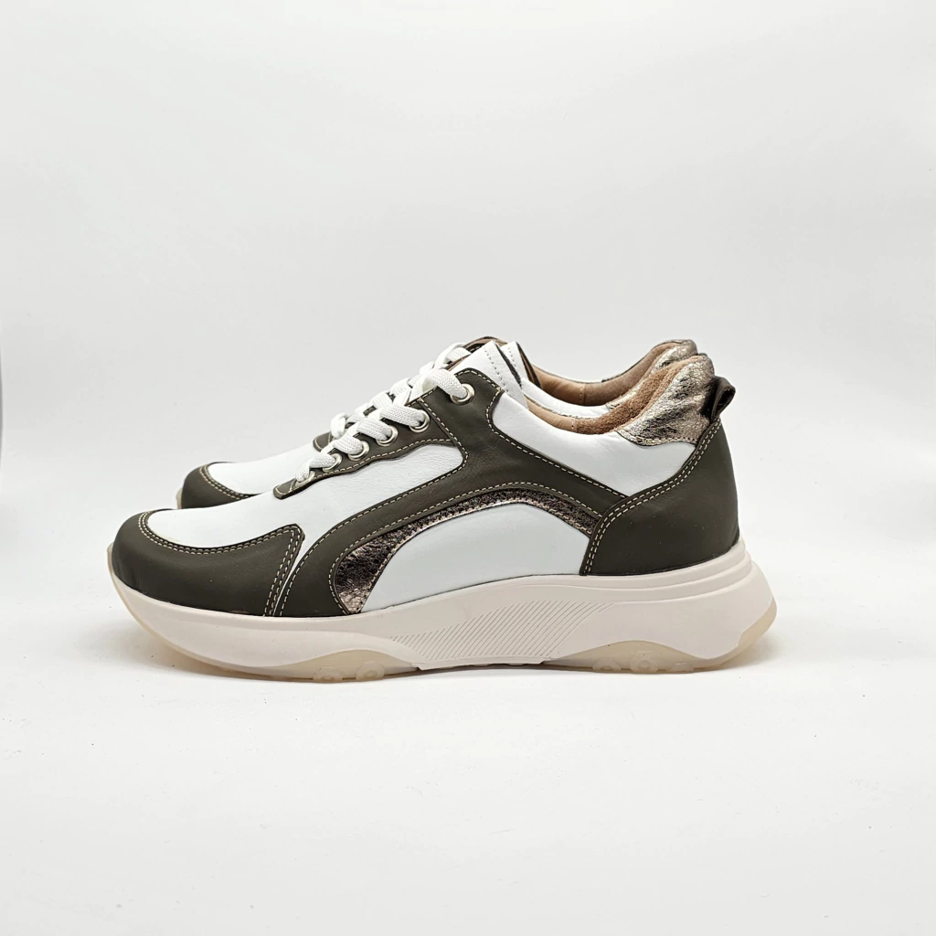 Zapatilla confeccionada en cuero con detalle de combinacion en cuero verde y metalizado5, forrada en cuero sobre, base de goma y altura aproximadamente de 4cm