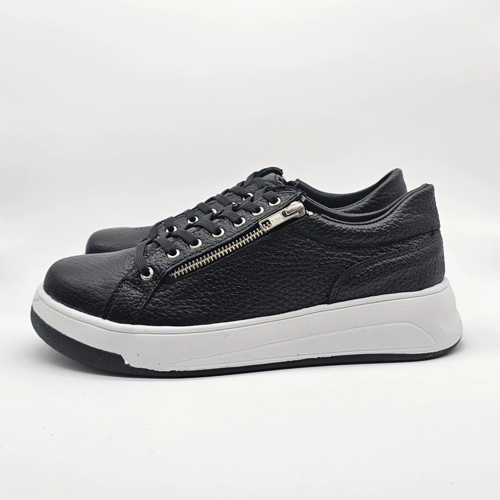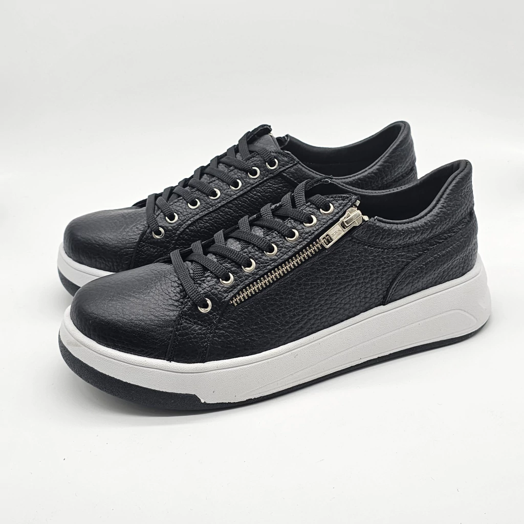 Zapatilla confeccionada artesanalmente en cuero vacuno graneado sobre base de goma.