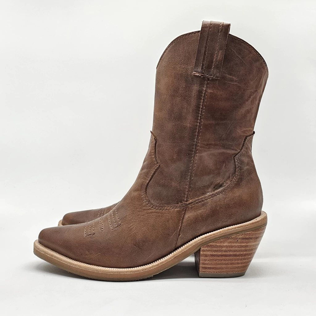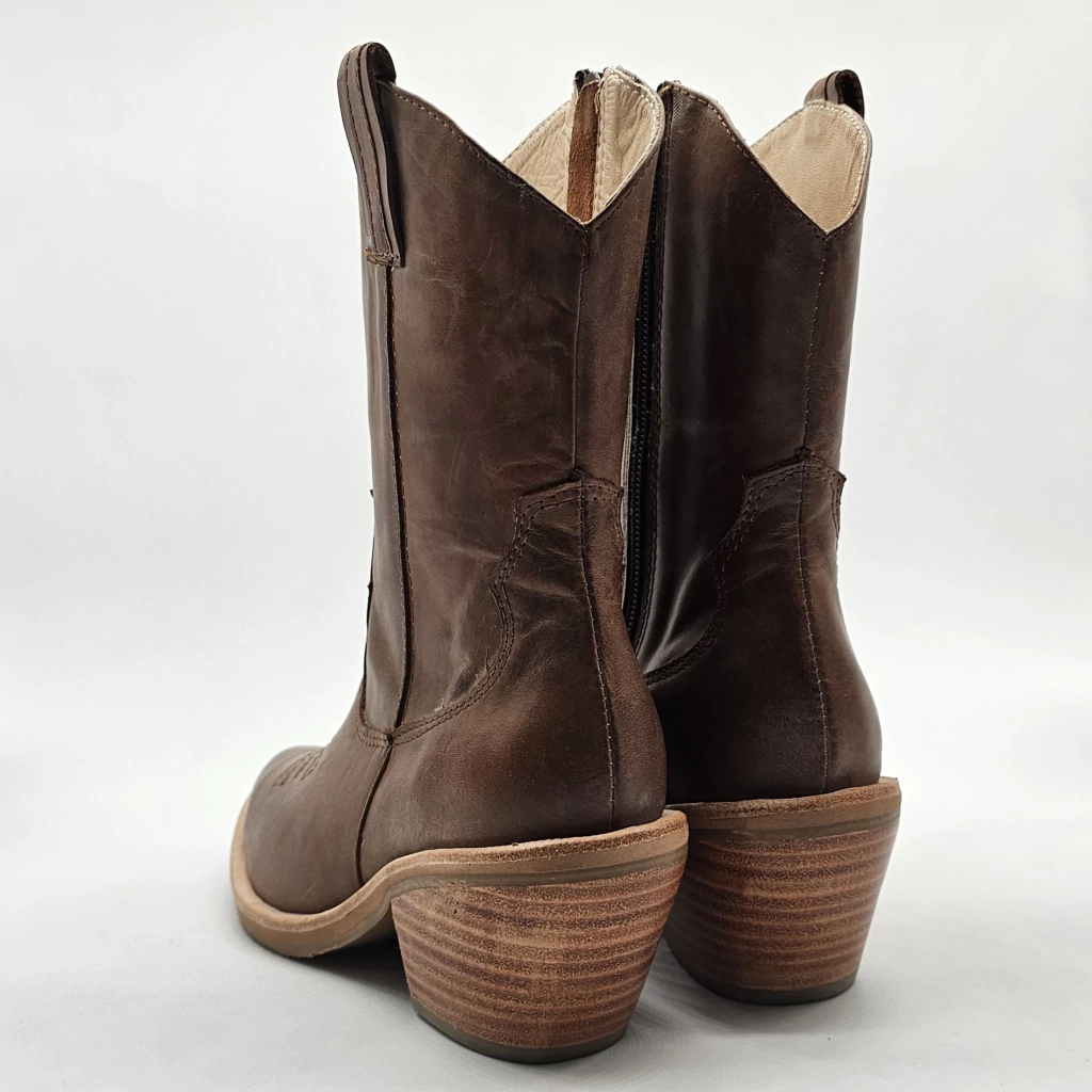 Bota texana confeccionada artesanalmente en cuero vacuno seleccionado en exterior e interior con cierre interno. Sobre base de goma y taco foliado.