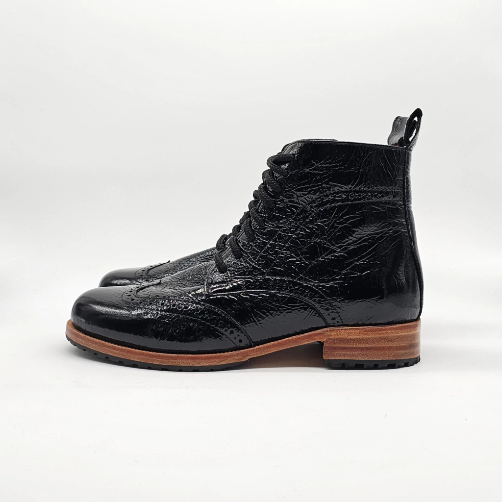 Bota artesanal confeccionada en cuero con detalles de picado y costuras en capellada . Sobre base de suela con vira rodada, con gomin antideslizante.