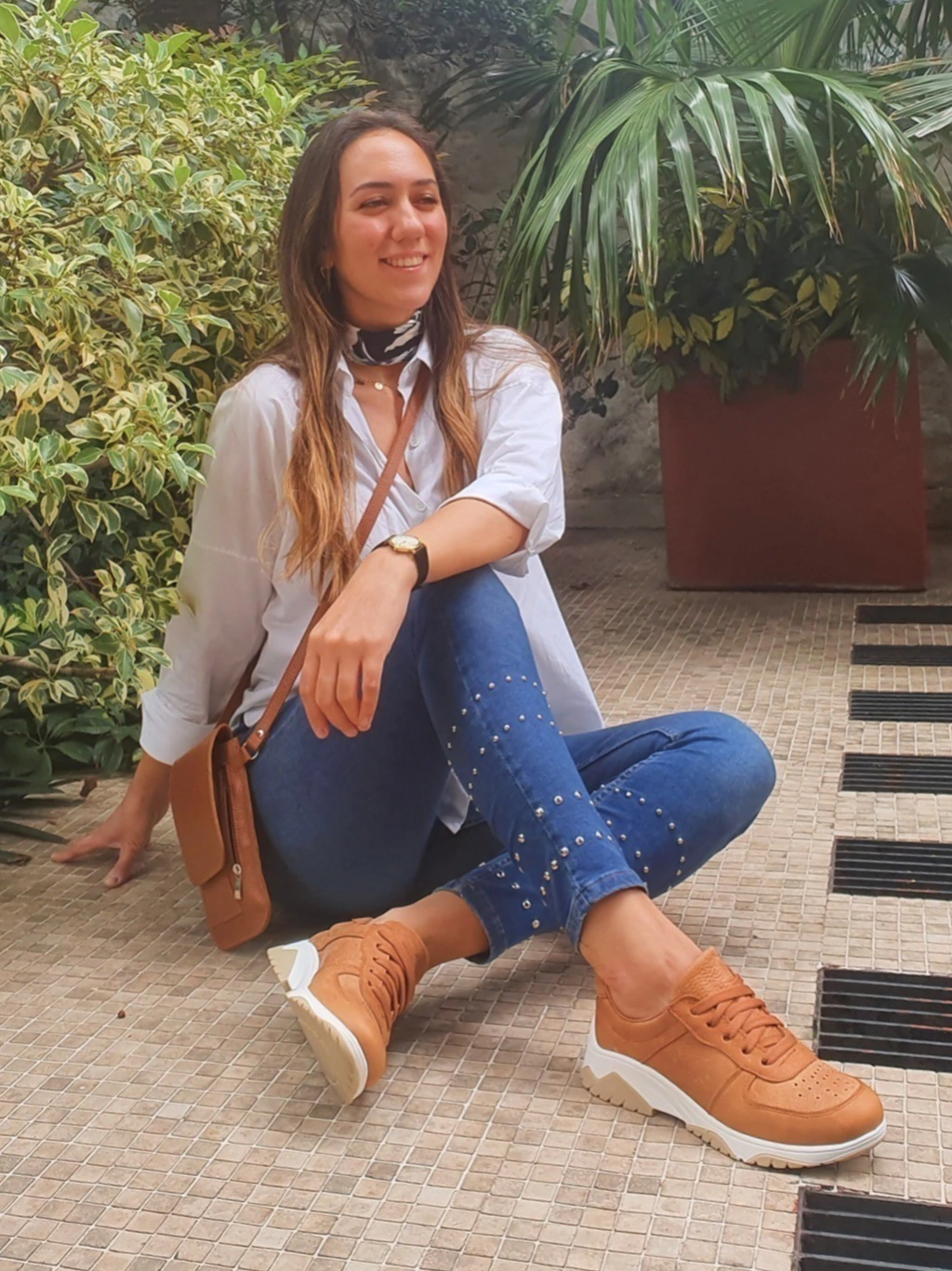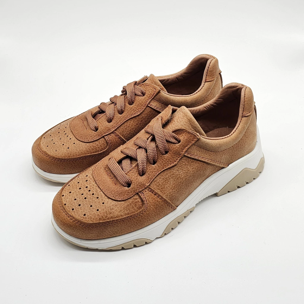 Zapatilla confeccionada artesanalmente en cuero vacuno seleccionado sobre base bicolor liviana con taco de 3,5 cm.