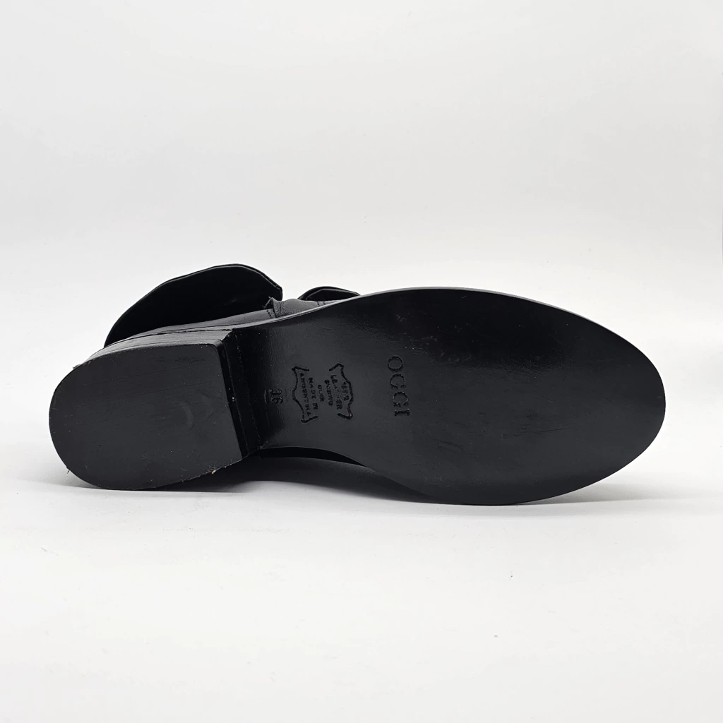 Bota confeccionada en cuero graneado con detalle de cierre exterior y cuello volcado. Altura de caña 12cm volcada y 17cm recta. Sobre base de