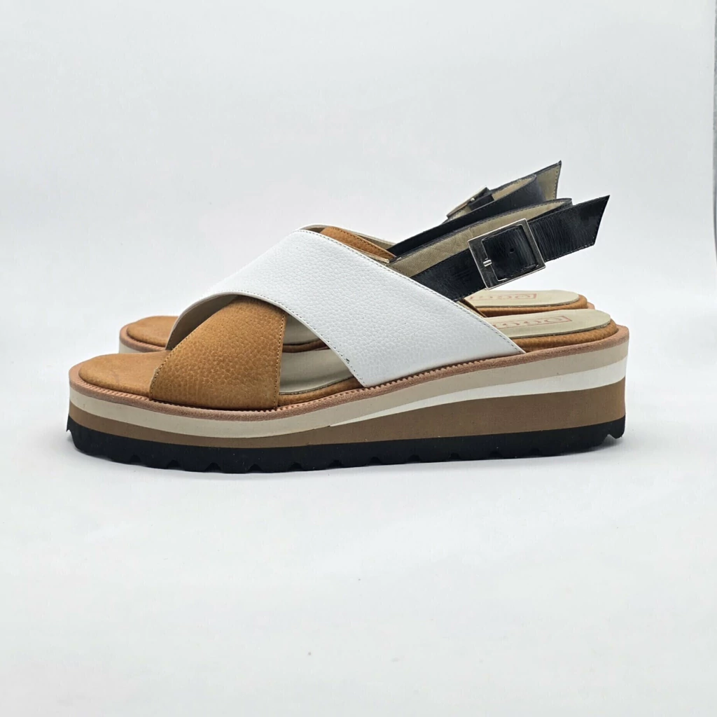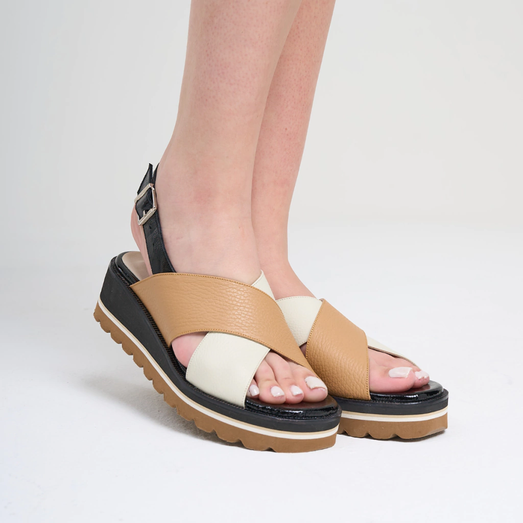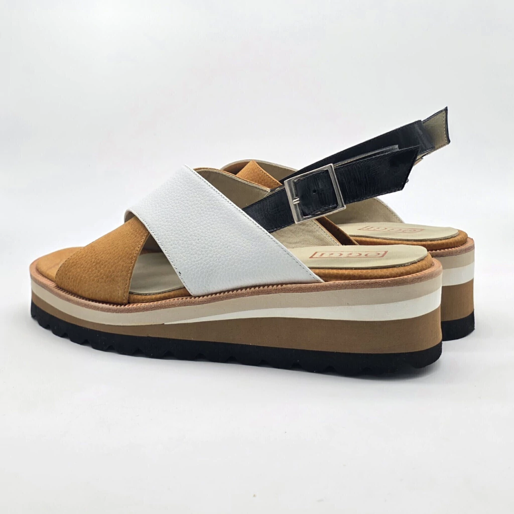 Sandalia confeccionada artesanalmente en cuero vacuno seleccionado en interior y exterior con detalle de combinación de colores y de tiras cruzadas para facilitar el calce. Sobre base de goma eva artesanal de alta densidad.
