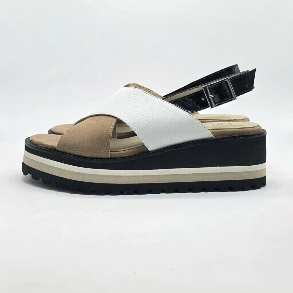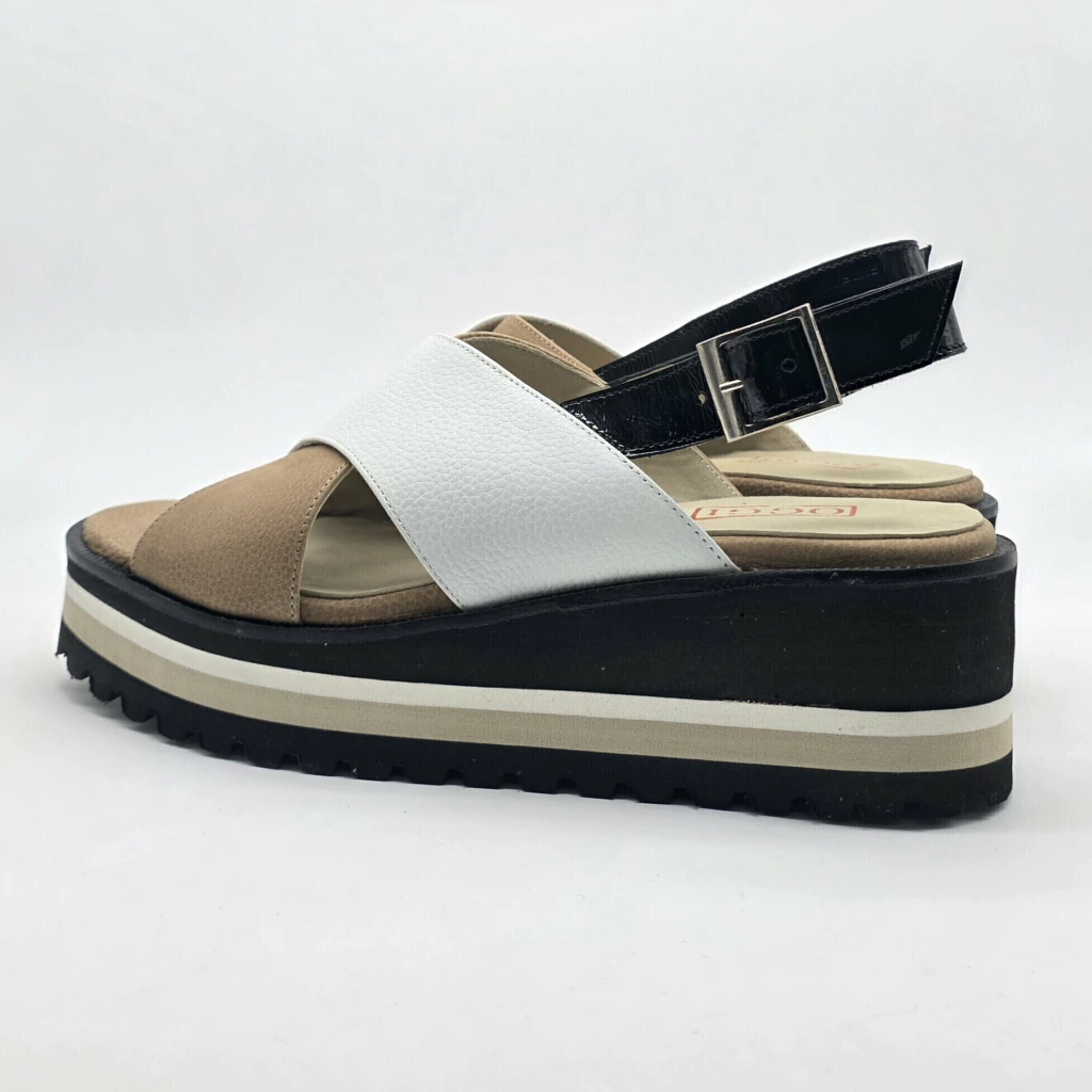 Sandalia confeccionada artesanalmente en cuero vacuno seleccionado en interior y exterior con detalle de combinación de colores y tiras cruzadas para facilitar el calce. Sobre base de goma eva artesanal de alta densidad.