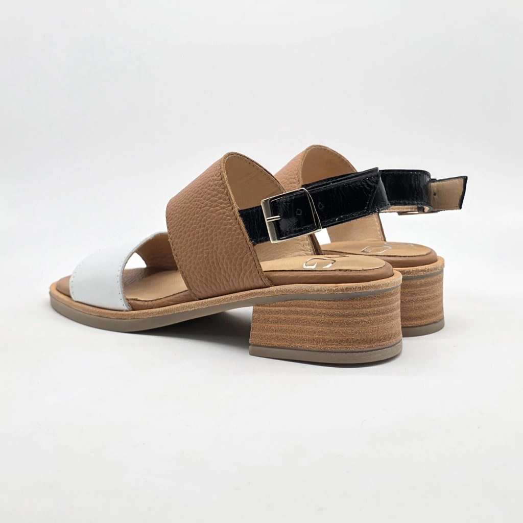 Sandalia confeccionada artesanlamente en cuero vacuno graneado sobre base de goma antideslizante con taco foliado al ácido de 2cm de altura.