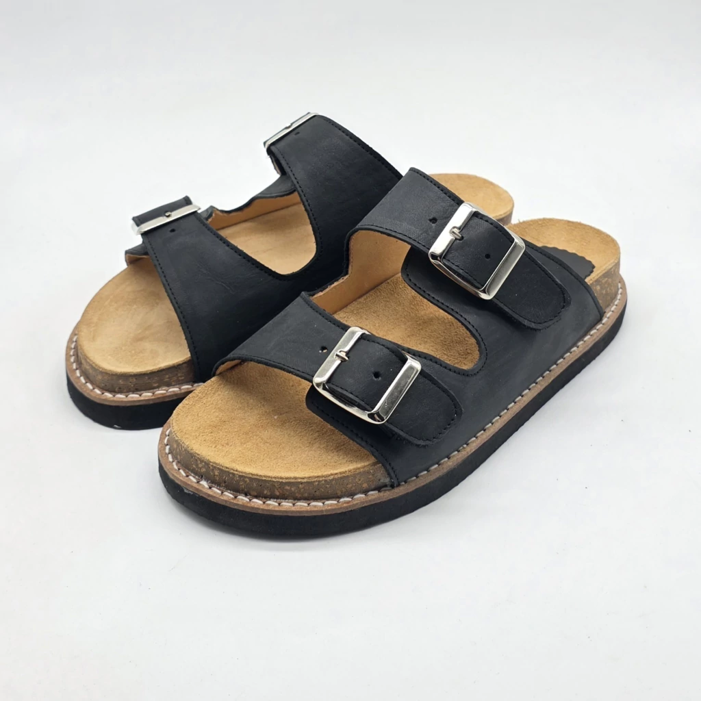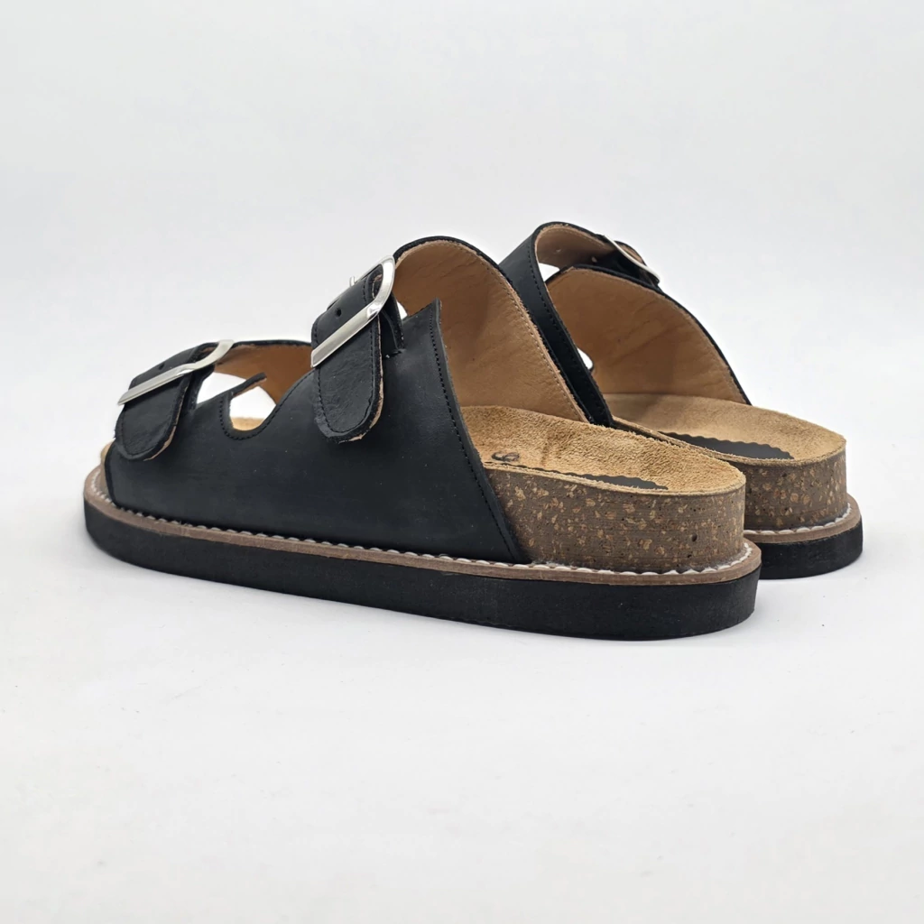 Sandalia tipo Birk, confeccionada en cuero vacuno tanto en su exterior como el su interior.