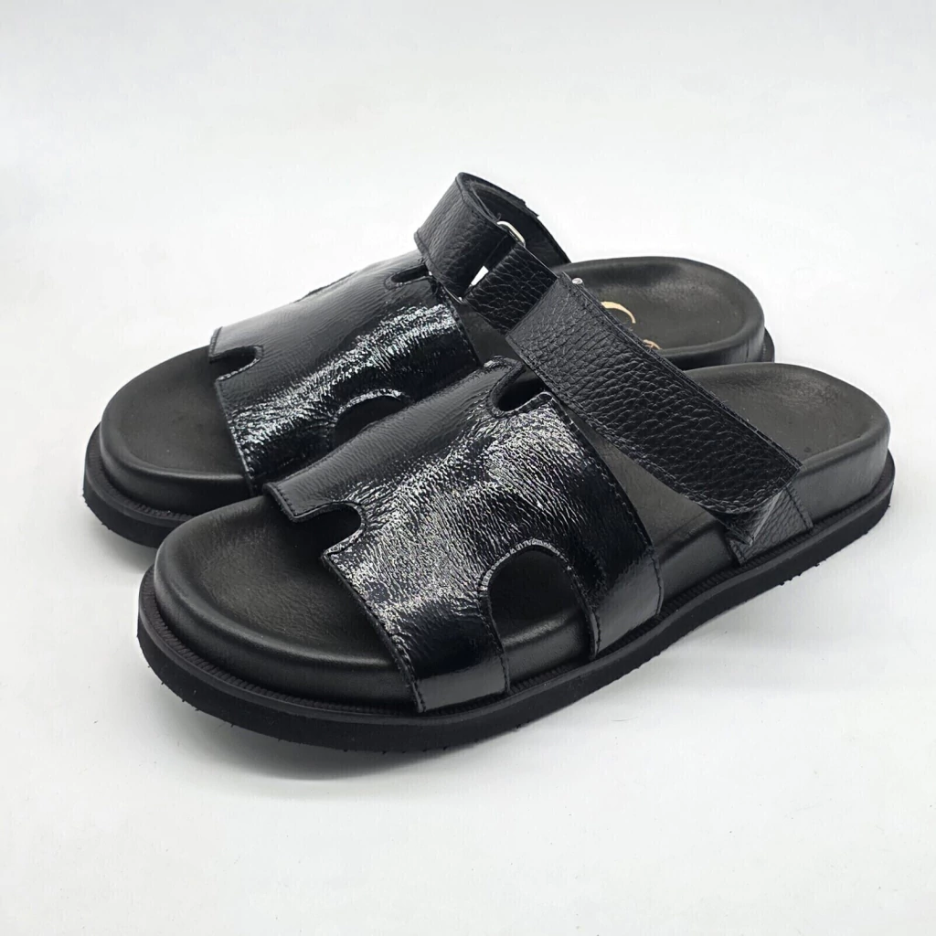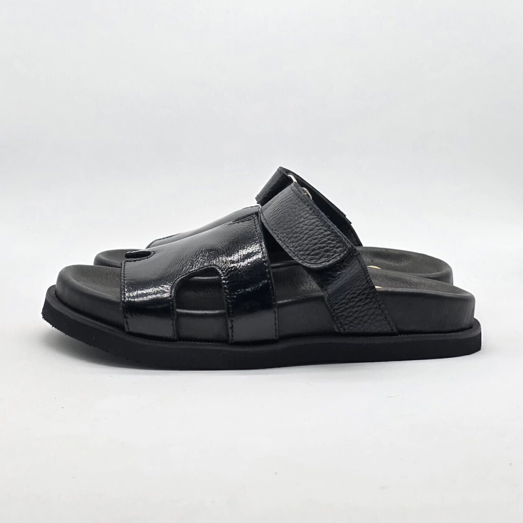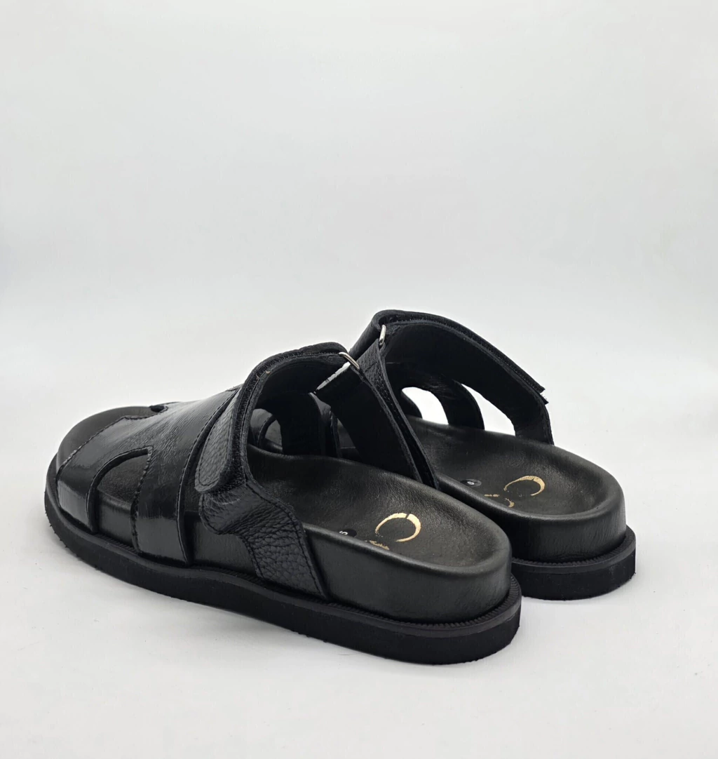 Sandalia tipo birk confeccionada artesanalmente, con capellada en forma de H y tira con velcro en el empeine, en cuero vacuno seleccionado en exterior e interior.