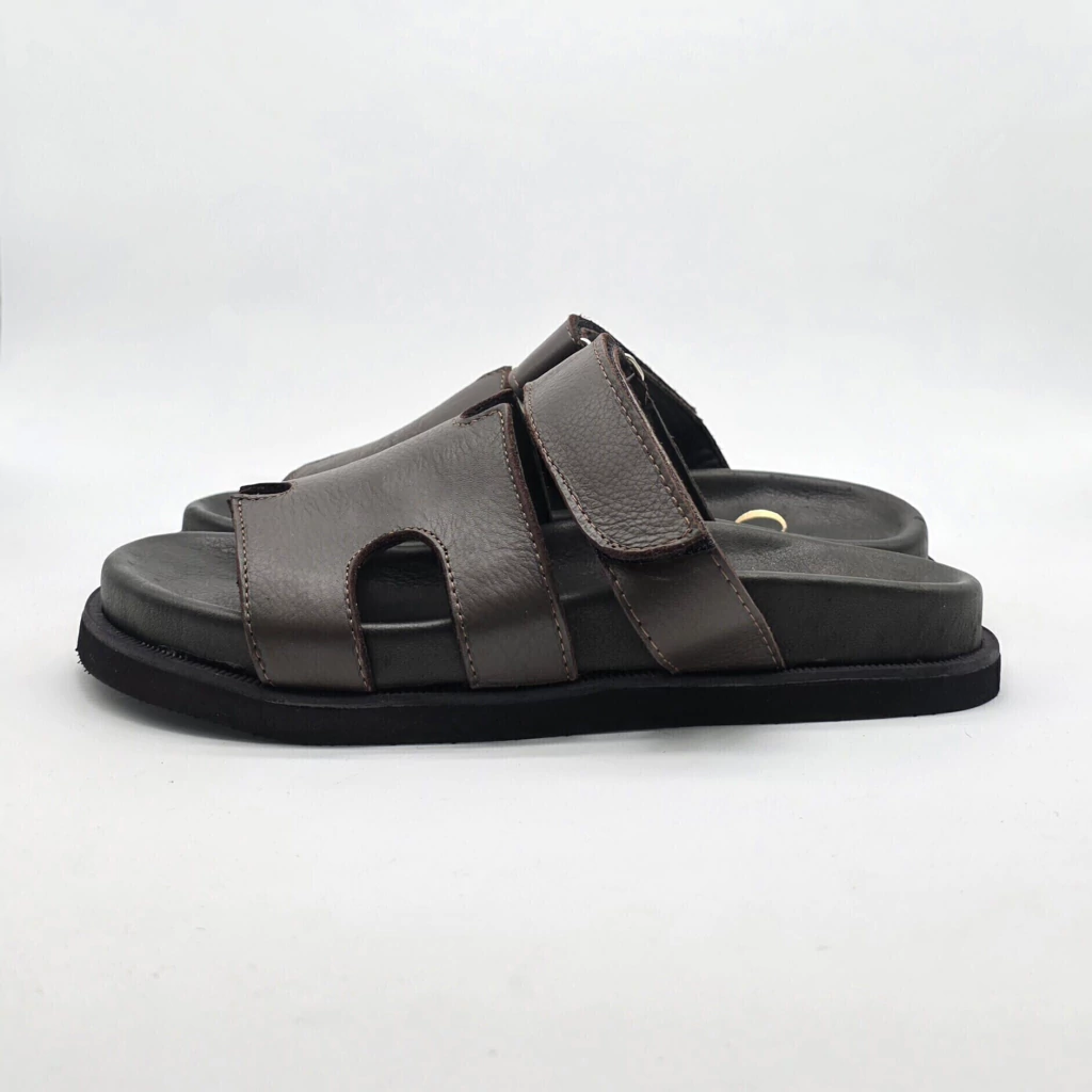 Sandalia tipo birk confeccionada artesanalmente, con capellada en forma de H y tira con velcro en el empeine en cuero vacuno seleccionado en exterior e interior.