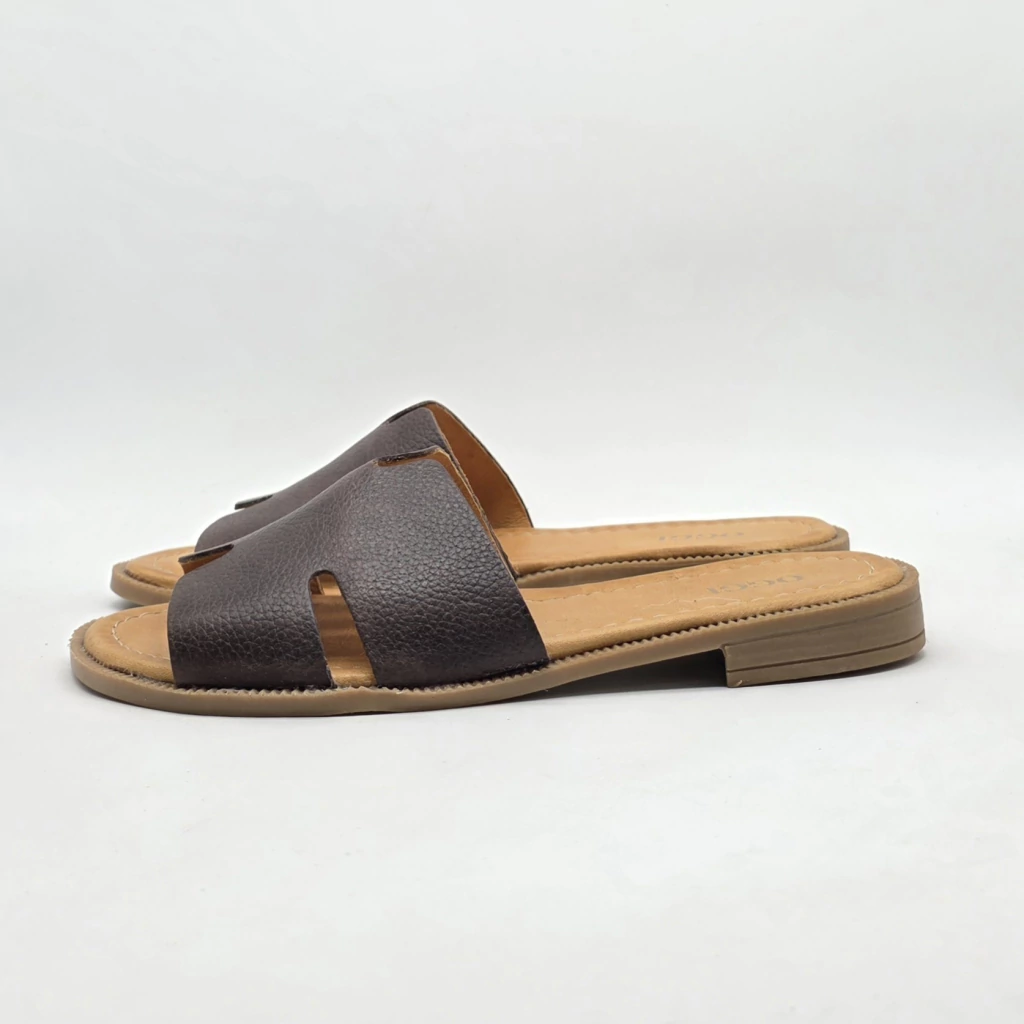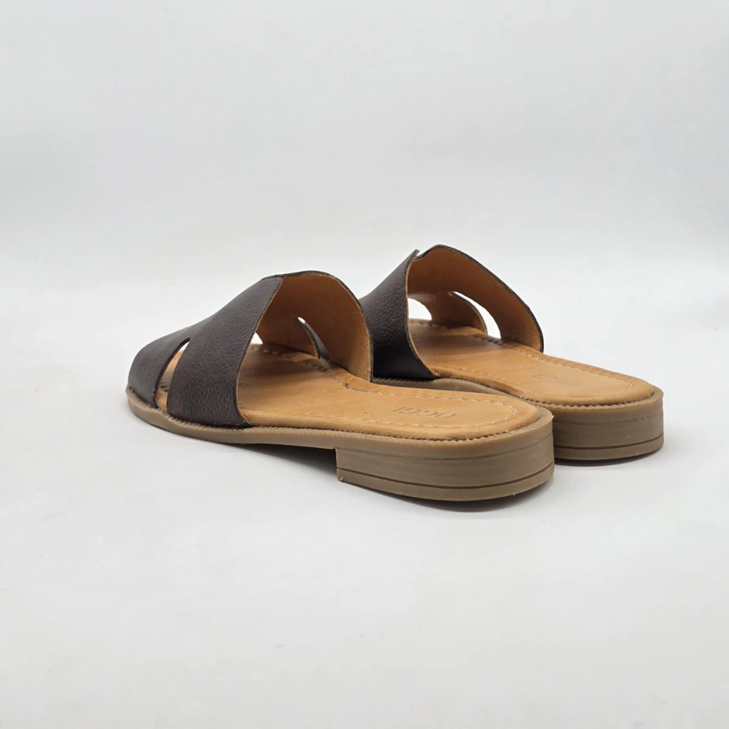 Sandalia confeccionada artesanalmente en cuero vacuno seleccionado. Sobre base de goma liviana y flexible con plantilla acolchada.