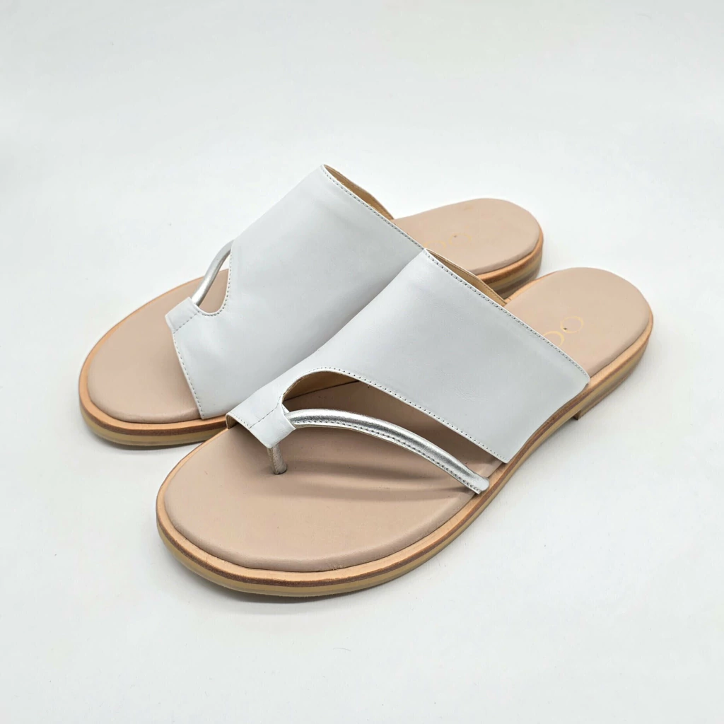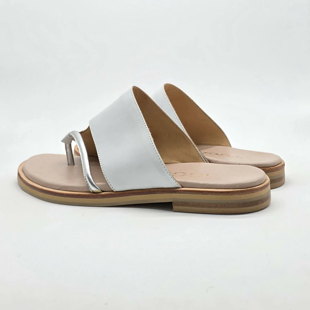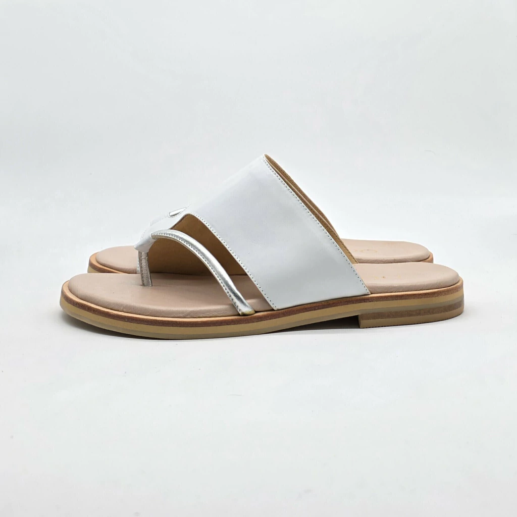 Sandalia confeccionada en cuero vacuno seleccionado en exterior e interior, con detalle de tira metalizada sobre base con plantilla de cuero acolchada, con vira de suela corrida , entresuela de goma y terminacion goma antideslizante .