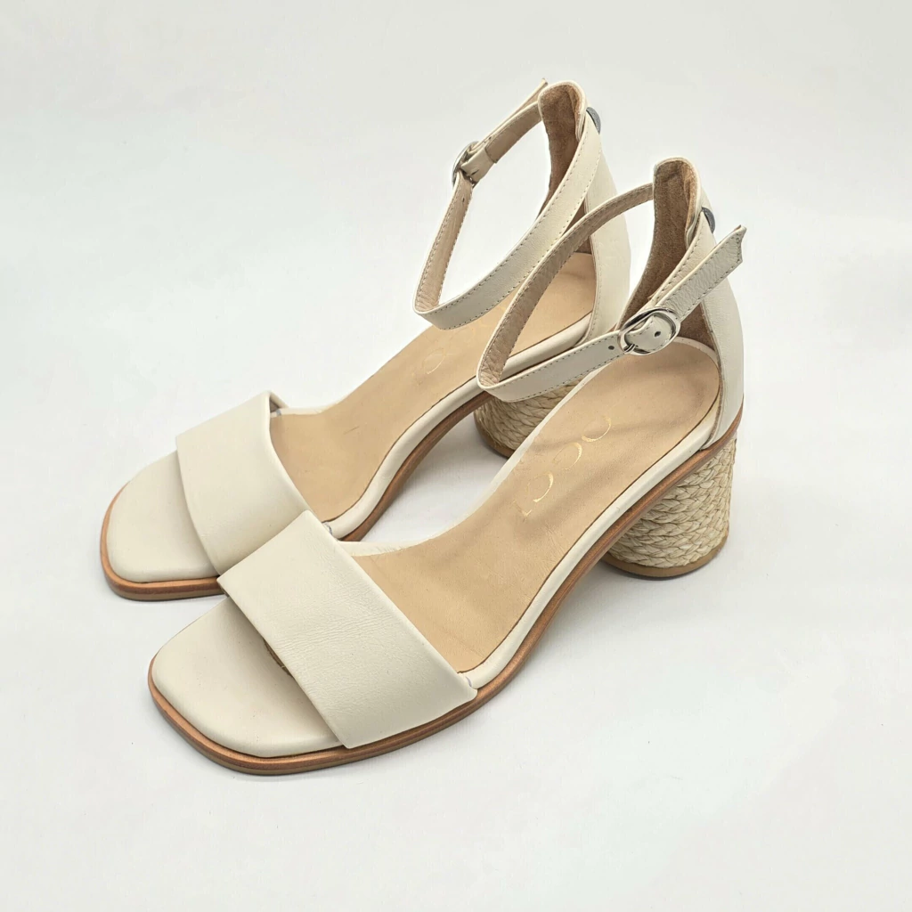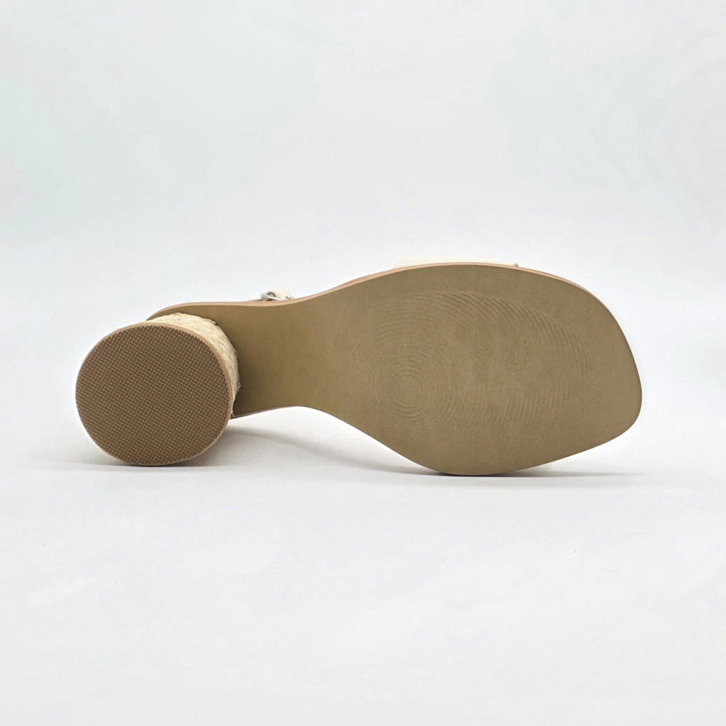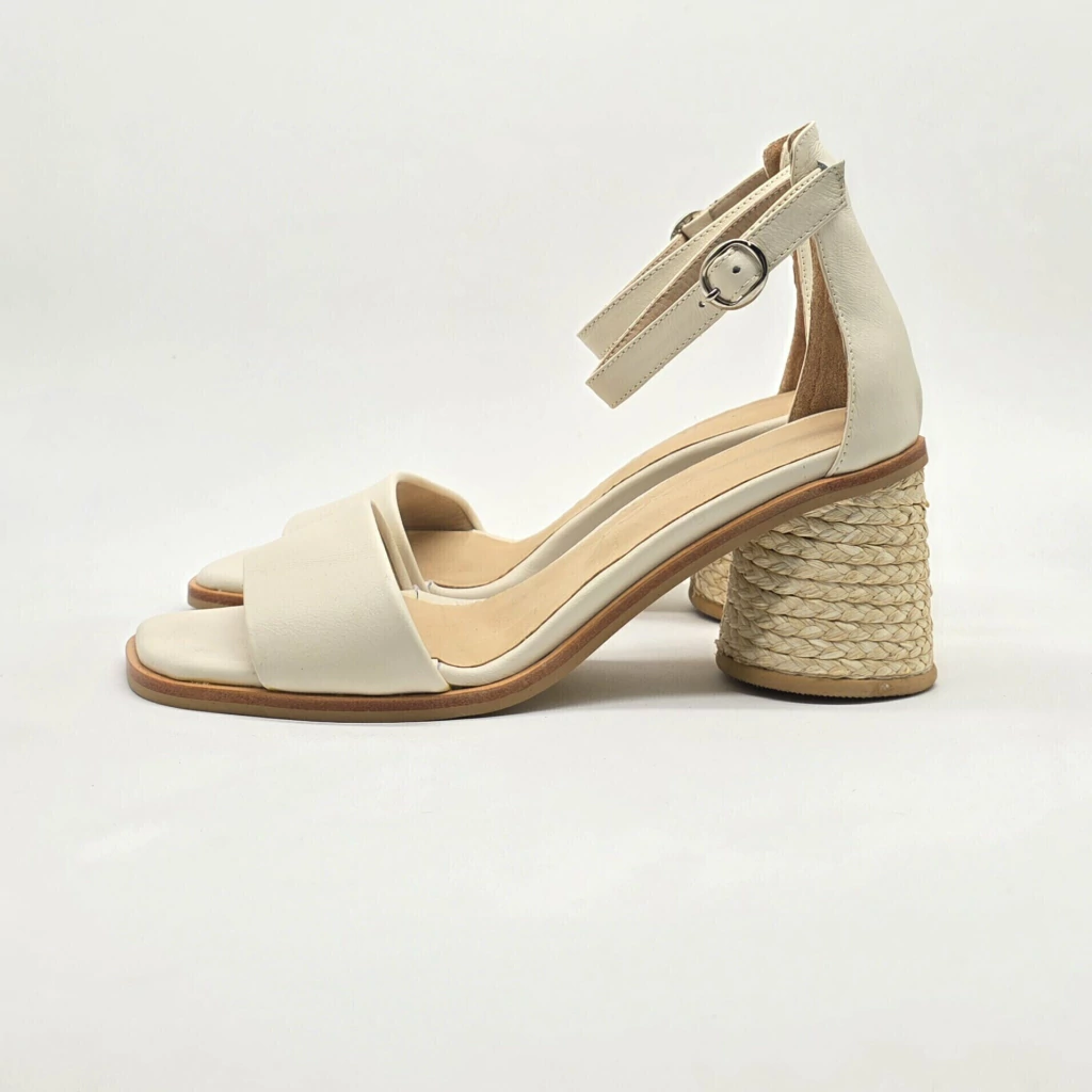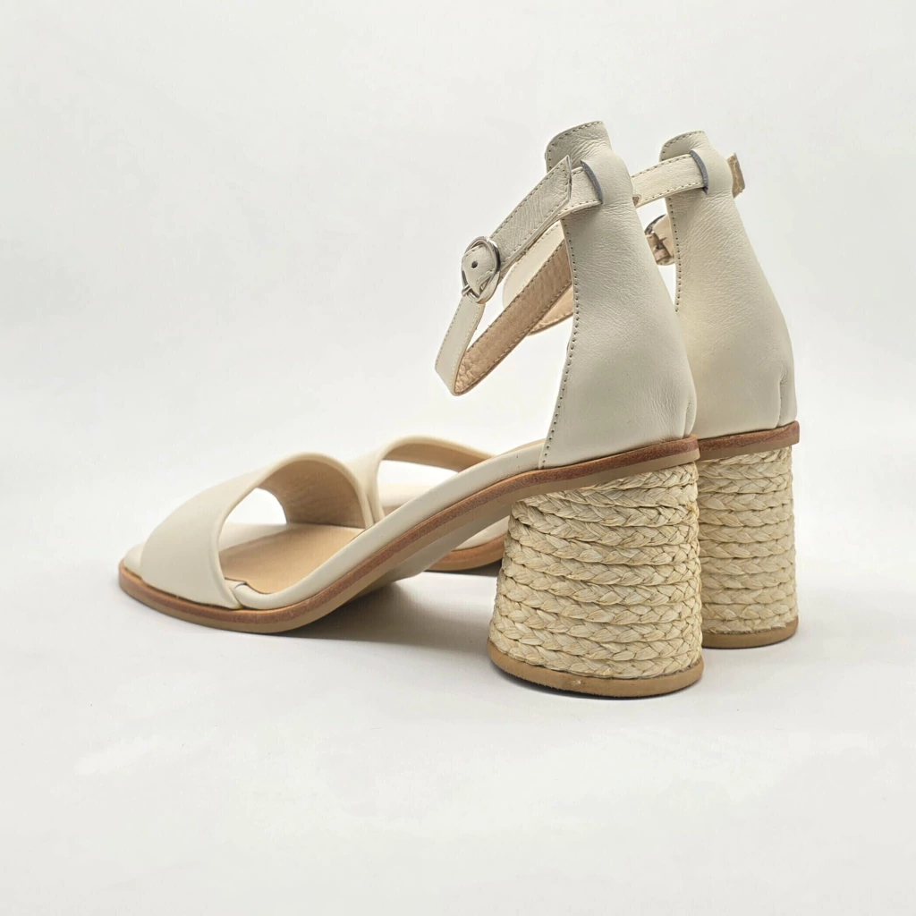 Sandalia confeccionada artesanalmente en cuero vacuno seleccionado en exterior e interior. Sobre base de suela y taco forrado en yute natural trenzado.