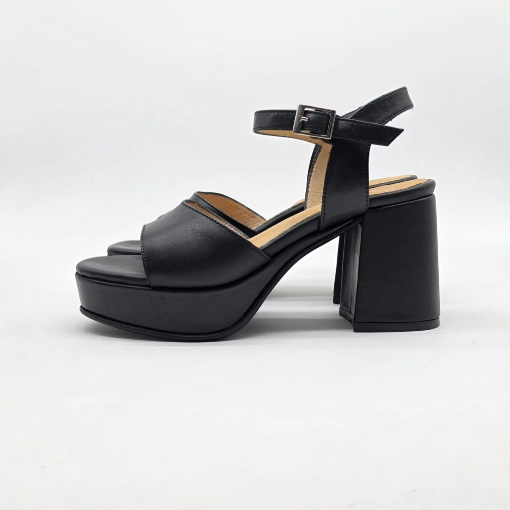 Sandalia confeccionada artesanalmente en cuero vacuno seleccionado en exterior e interior con detalle de plataforma que compensa la altura del taco asegurando el confort.