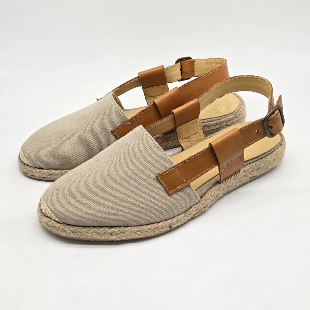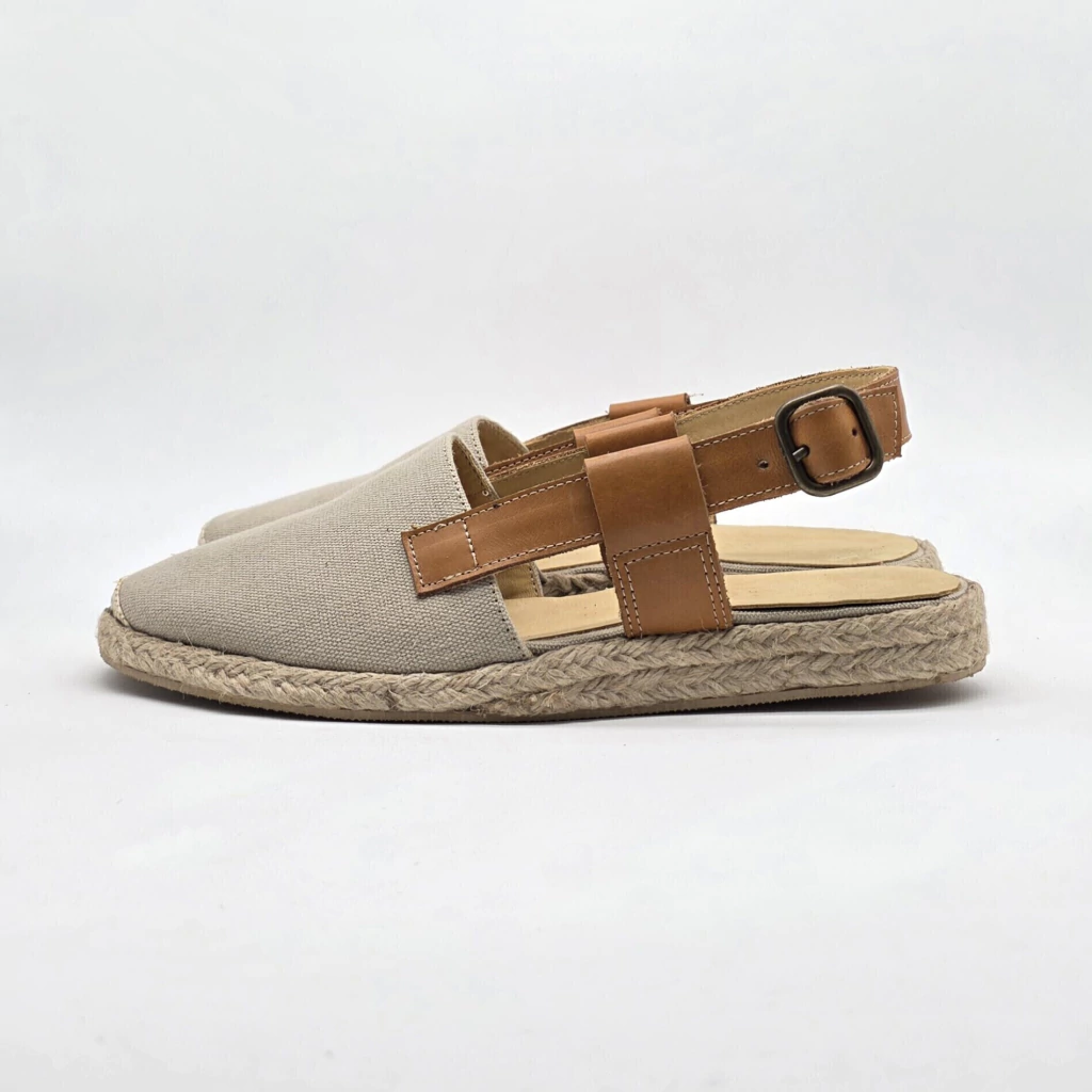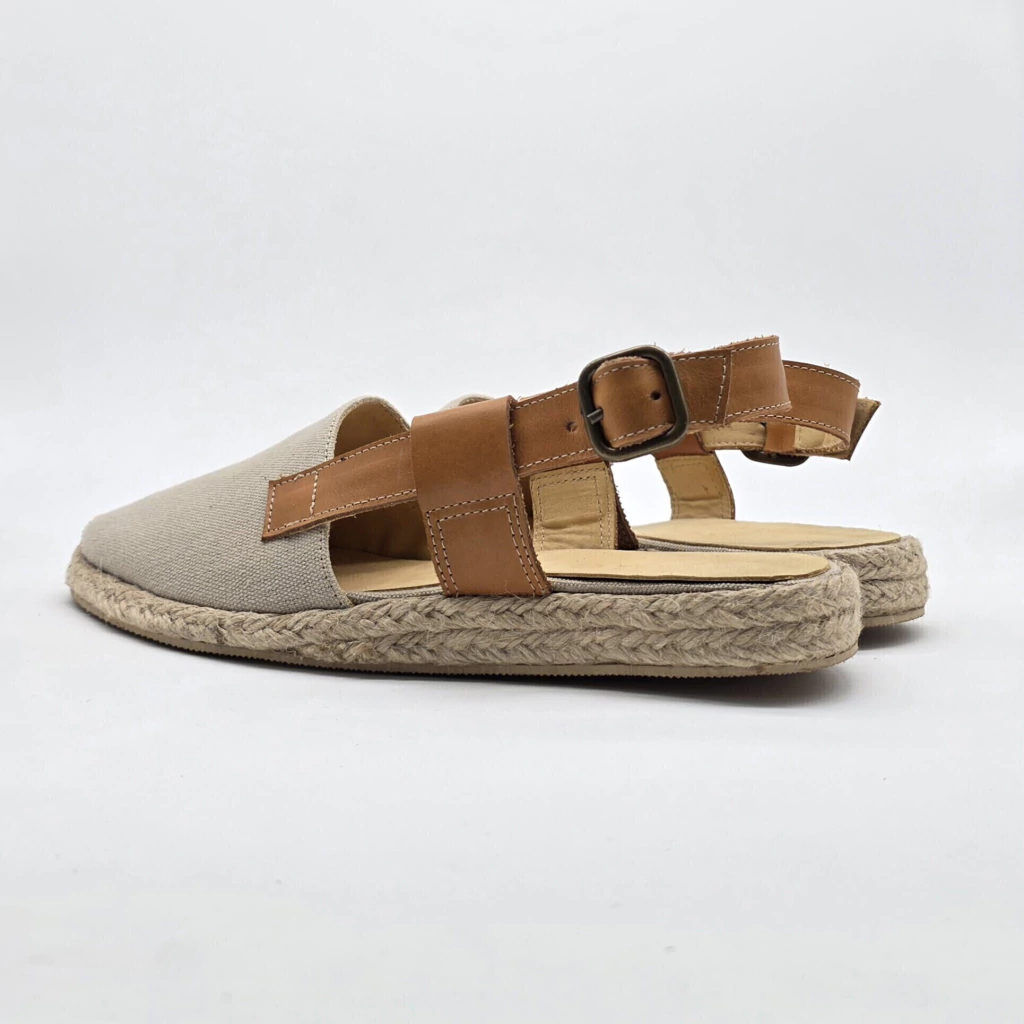 Descubre la sandalia Valencia, una pieza excepcional confeccionada en tela forrada en cuero vacuno, que combina elegancia y confort. Su diseño sobre una base artesanal de yute natural y goma antideslizante de 2,5 cm de altura, garantiza estabilidad y un andar placentero.