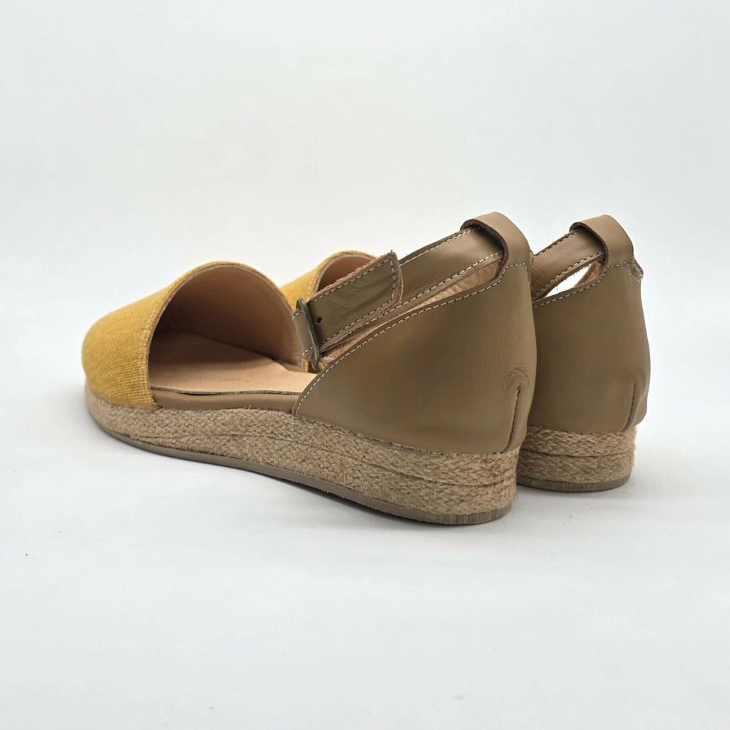 Sandalia con capellada punta cerrada en tela tramada y talon de cuero con pulsera, integramente forrada en cuero sobre una base forrada en yute en cuña.