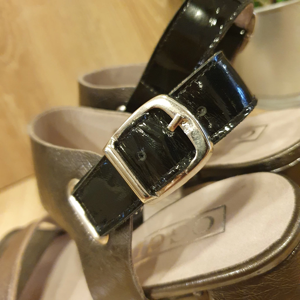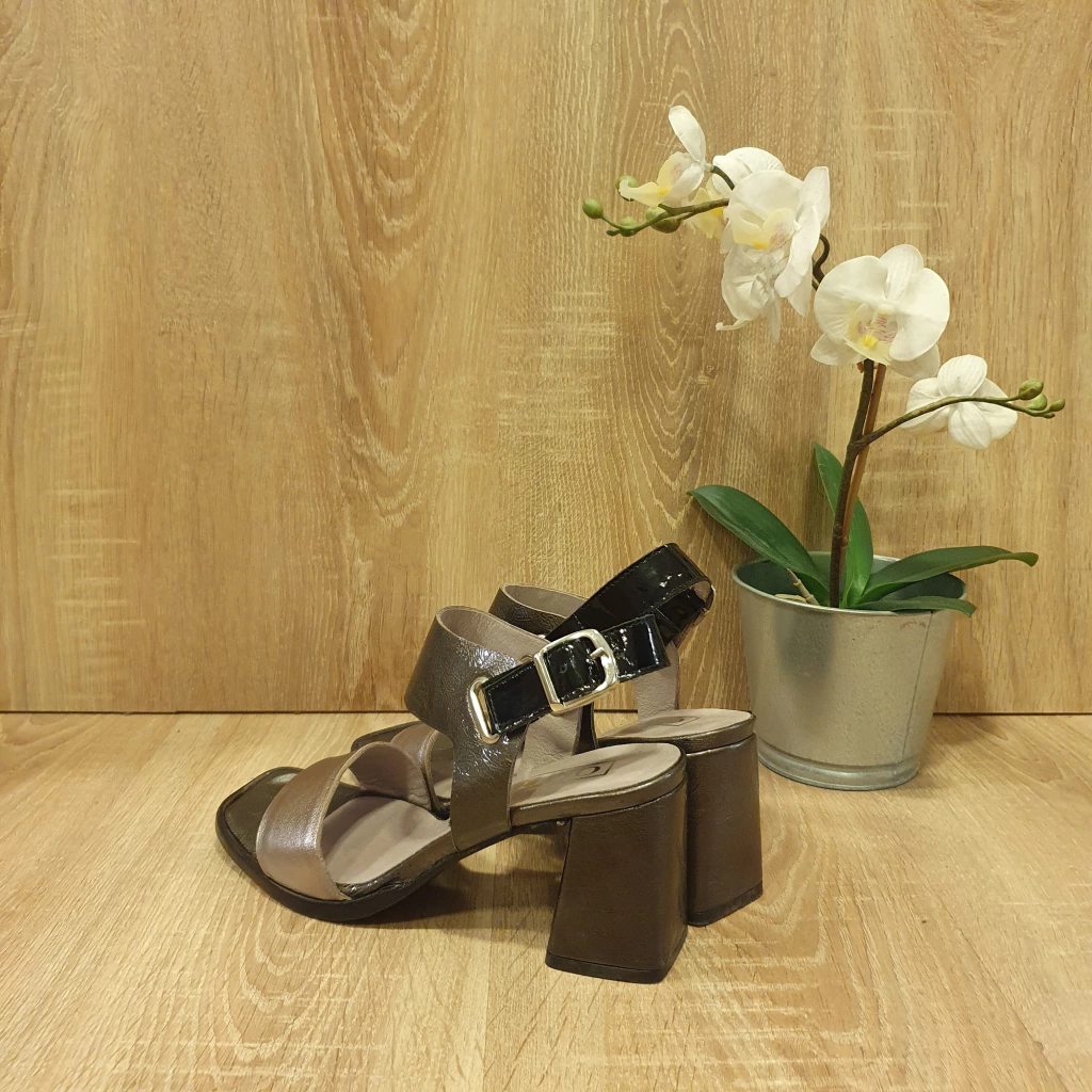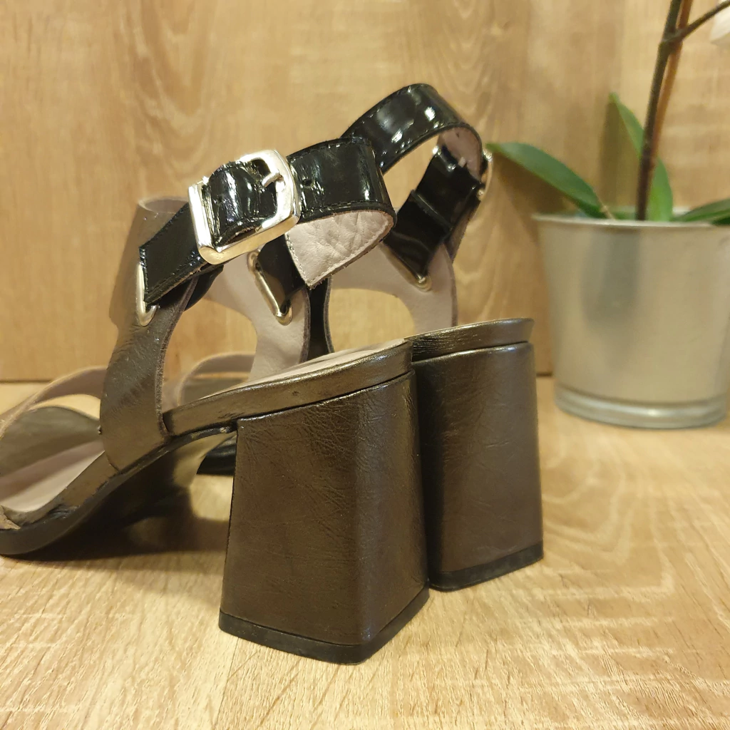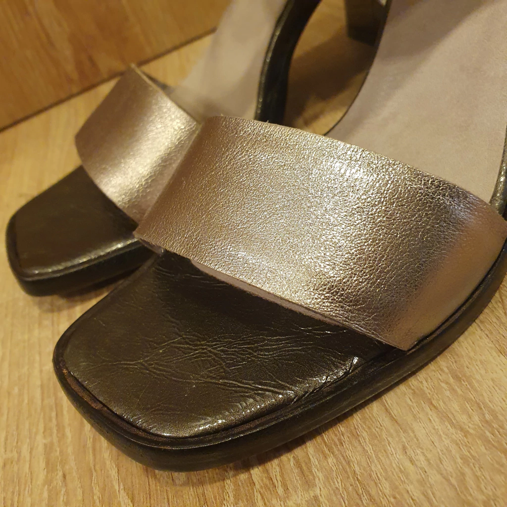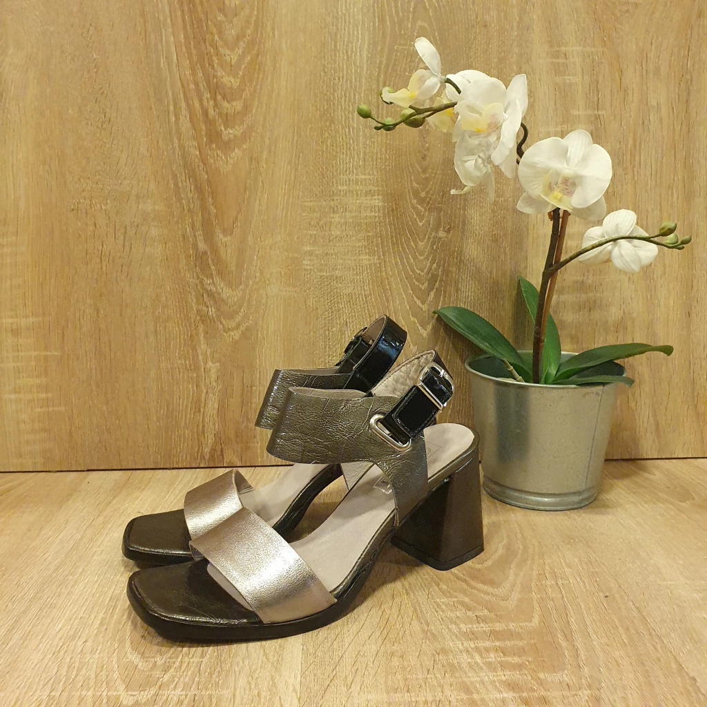 Sandalia confeccionada integramente en cuero vacuno sobre base de suela. Con detalle de taco foliado terminación ácido.