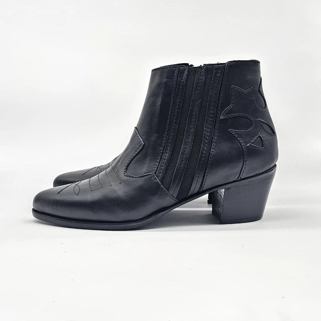 Bota texana confeccionada artesanalmente en cuero vacuno seleccionado con detalle de cierre interno y elastico externo. Sobre base de suela.